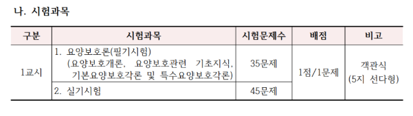 요양보호사 자격증 취득을 위한 시험 과목은 필기시험인 요양보호론이 실시되며, 요양보호개론, 요양보호관련 기초지식 및 기본 요양보호간론과 특수요양보호각론 에서 35문제가 출제 됩니다. 객관식 5지 선다형으로 1문제에 1점씩 35만점이며, 시험 응시 시간은 총 40분의 시간이 진행 됩니다. 필기시험 이후 2교시는 실기시험이 이뤄지며, 45문제가 출제됩니다.