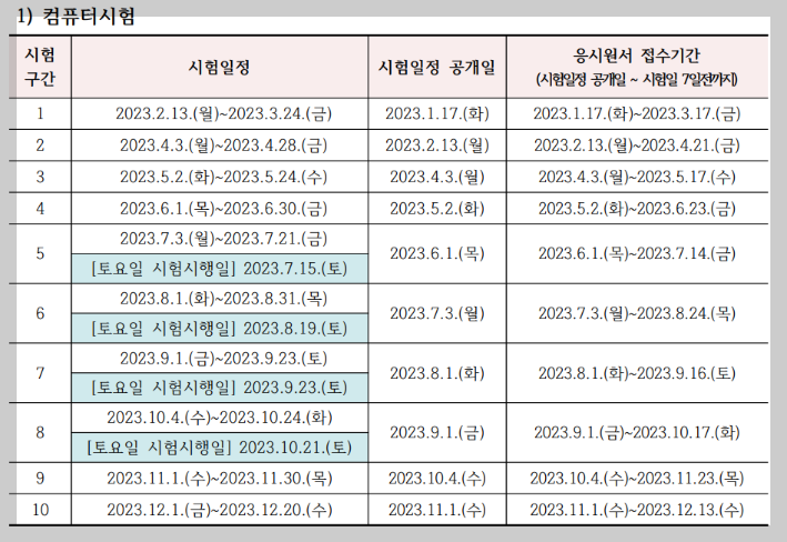 그렇기에 컴퓨터 시험이 부담스러운 경우 토요일 시험일정을 아래 표를 통해 참고 하시기 바랍니다.
