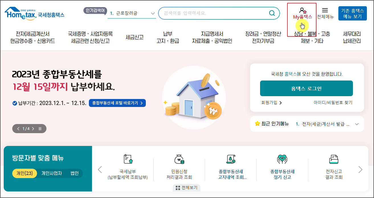 - 홈택스 홈페이지 접속 후 본인인증 로그인 - my 홈택스 클릭.