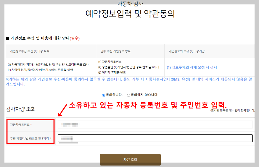 3. 정기검사를 진행할 차량 번호 및 소유주 주민번호 입력 (법인차량일 경우 사업자번호 입력)