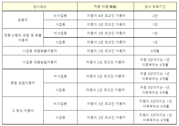 2. 차량 종류 별 사업용에 따라서 검사 유효기간이 상이함.