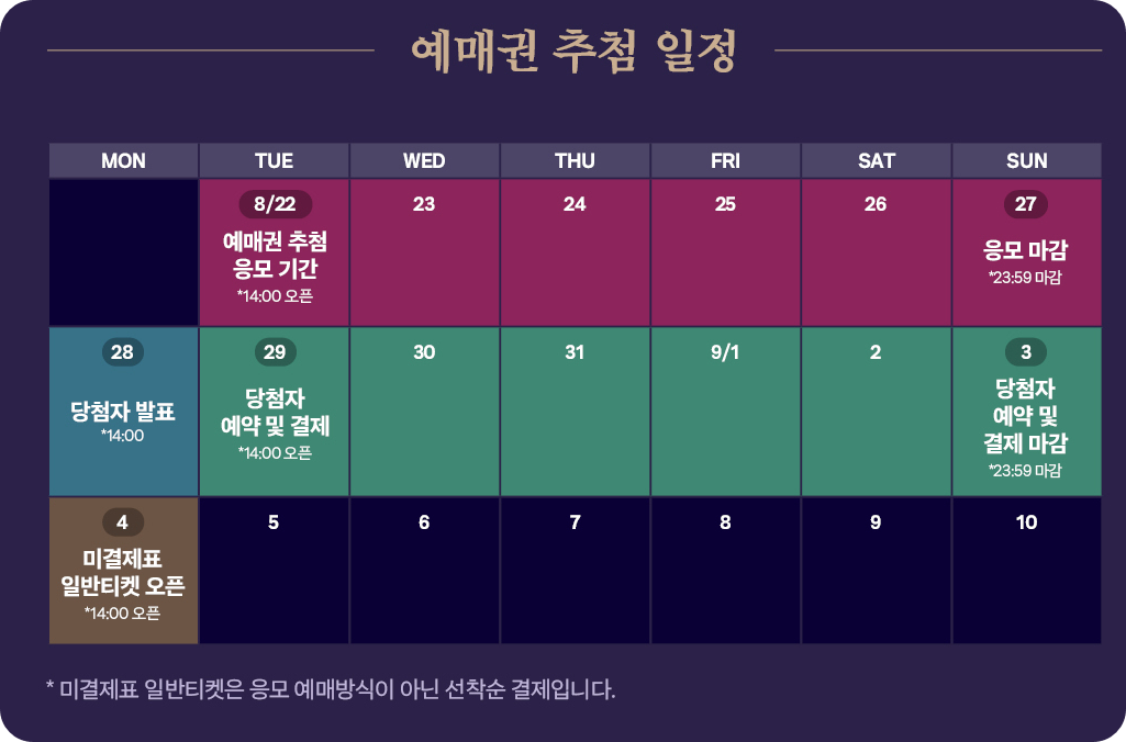 | 예매권 당첨자 발표 | 2023년 8월 28일 14:00 문자 발송. |