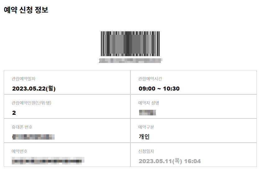 청와대 관람예약의 경우 1인 1회에 한해 예약이 가능, 중복예약은 불가능 합니다. 예약이 완료되면 예약자의 휴대폰번호로 안내정보가 발송되며, 청와대 관람을 위한 방문시 예약시 전송받은 바코드를 제시 후 입장이 가능합니다. 관람신청등록을 완료하게 되면 아래와 같이 예약신청정보 (관람일자, 예약시간, 인원, 성명, 예약번호등)와 바코드가 생성된 정보를 확인가능합니다.