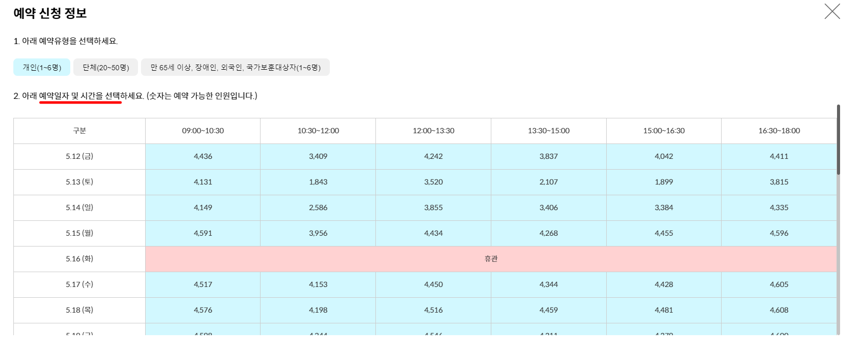 - 예약신청정보 - 날짜별 신청현황 조회 및 예약신청 클릭.