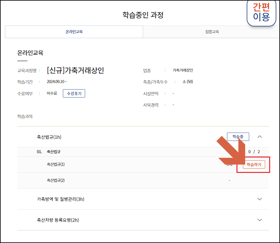 아래는 축산관련종사자 교육정보시스템네 신규 온라인 교육 및 집합교육 신청방법 예시입니다. 보수교육 또한 같은절차로 진행되니 이를 참고하시어 해당 축산관련종사자 의무교육을 이수하시기 바랍니다.