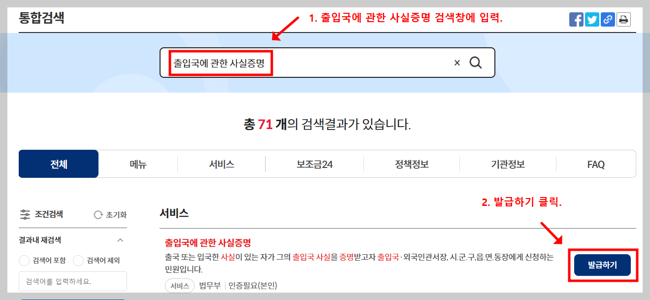 - 검색창내 출입국에 관한 사실증명 입력.