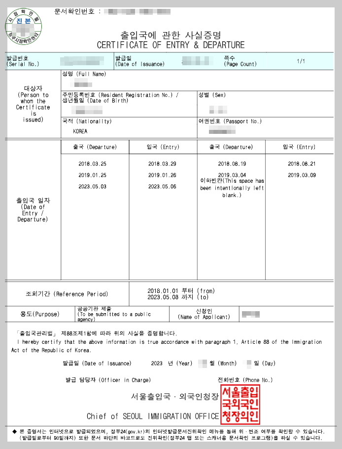출입국사실증명서는 대한민국에서 여권의 발급 및 사용, 출입국 기록, 사용기록 등의 정보를 확인하는데 사용되는 문서로, 외국여행, 비자신청, 주택매매, 직장 등에서 제출을 요구하기도 합니다.