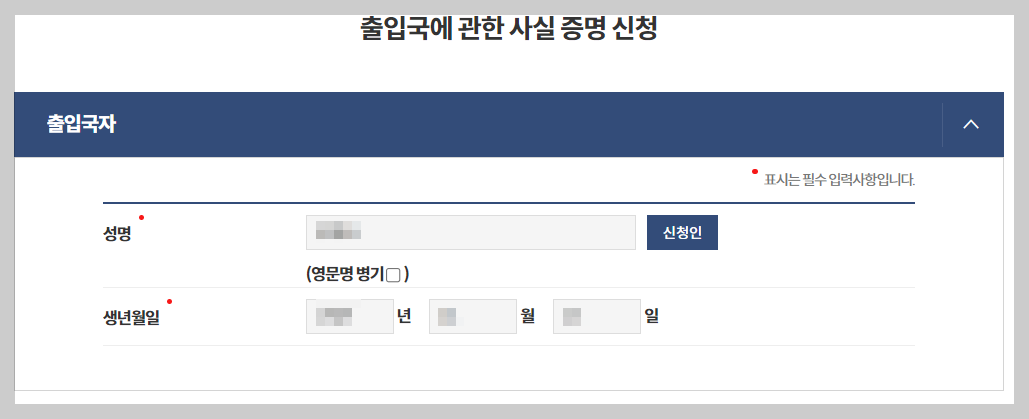 2. 신청서 작성 : 만약 오프라인 방문 발급을 진행할 경우 출입국 사실 증명 신청서를 작성, 신청서내 본인의 성명, 주민번호, 발급 목적, 출입국 이력등의 정보들을 기입합니다.