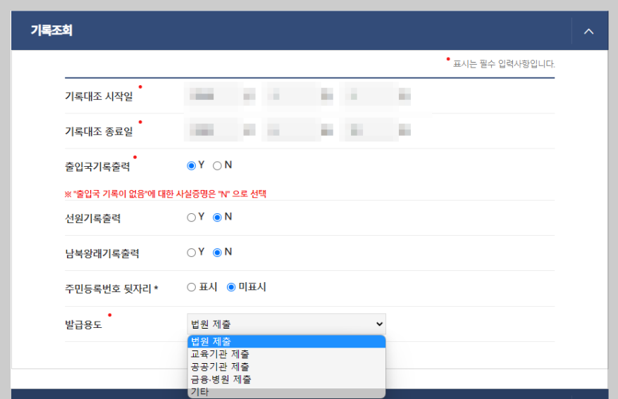 • 발급용도(법원/ 교육기관/ 공공기관 / 금융병원/ 기타) 선택.