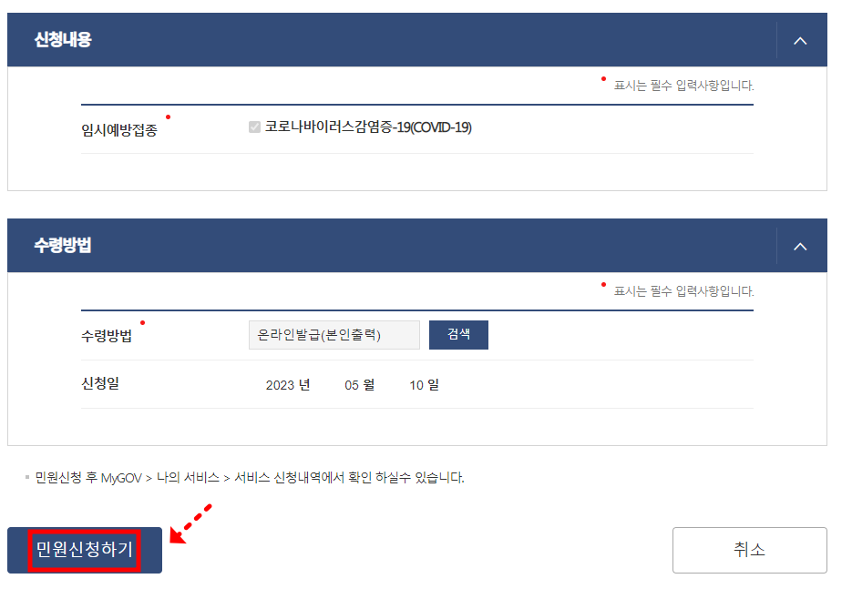 이후 신청내용내 코로나바이러스 감염증 19 증명서를 확인 수령방법은 온라인 발급 본인출력을 선택 후 민원신청하기를 진행합니다. 위의 과정을 진행하게 되면 실시간 증명서를 프린터 가능하며, 만약 pdf 저장을 원할 시 인쇄 - pdf 저장하기를 통해 코로나백신접종증명서를 pdf 파일로 pc내 저장할 수 있습니다.