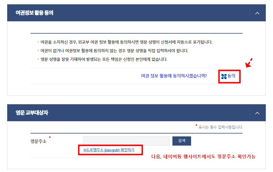 여권 정보 확용 동의시 영문 성명이 신청서에 자동 표기되며, 영문 도로명 주소는 아래 도로명주소 확인하기 또는 다음이나 네이버 포털사이트 내에서 영문주소를 검색창에 입력 후 본인의 거주지를 입력하게되면 영문 주소를 확인할 수 있습니다.