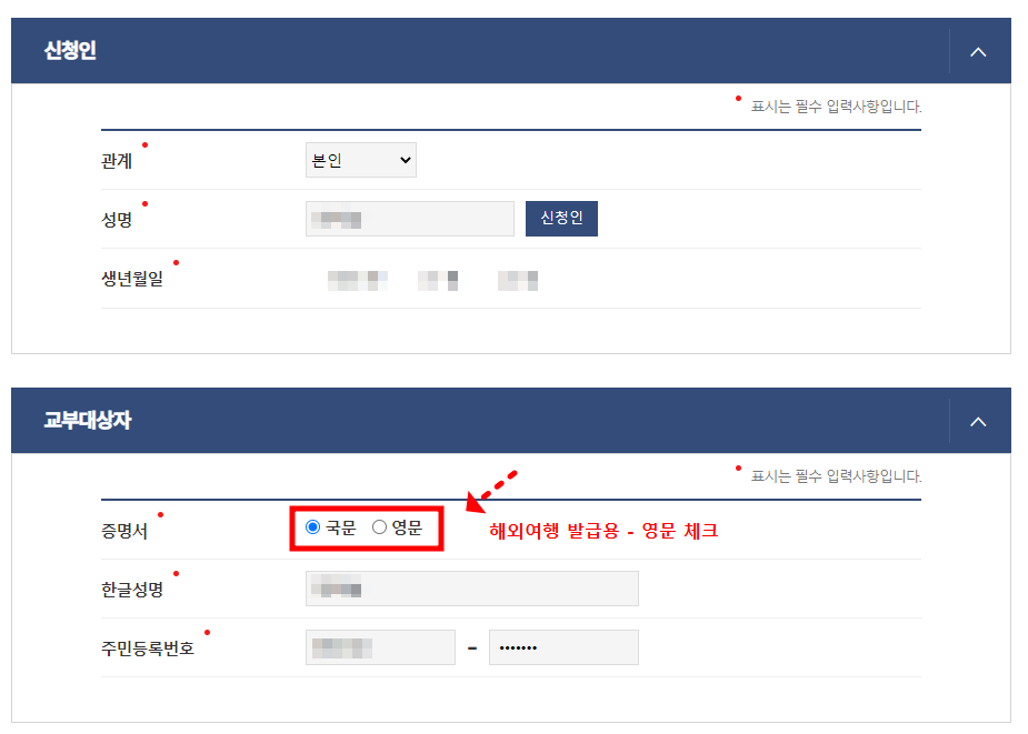교부대상자 입력시 국문을 클릭하게되면 바로 민원신청하기를 통해 발급이 진행되며, 해외 제출을 위한 영문 증명서 발급시 영문을 클릭- 여권정보 활용동의 체크 - 영문교부 대상자 영문주소를 입력 합니다.