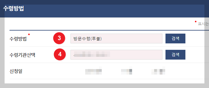 - 방문수령 및 온라인 열람(제출기관)일 시 수령/제출기관 검색 버튼을 통해 선택.
