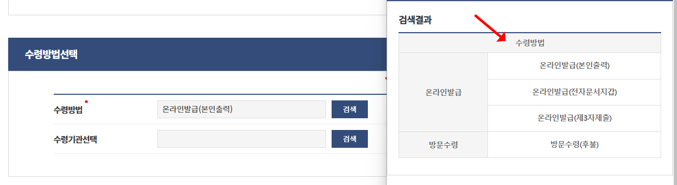 토지이용규제 포함시 시간이 걸림. - 수령방법 겁색 버튼 클릭 후 수령방법 검색창내 선택.