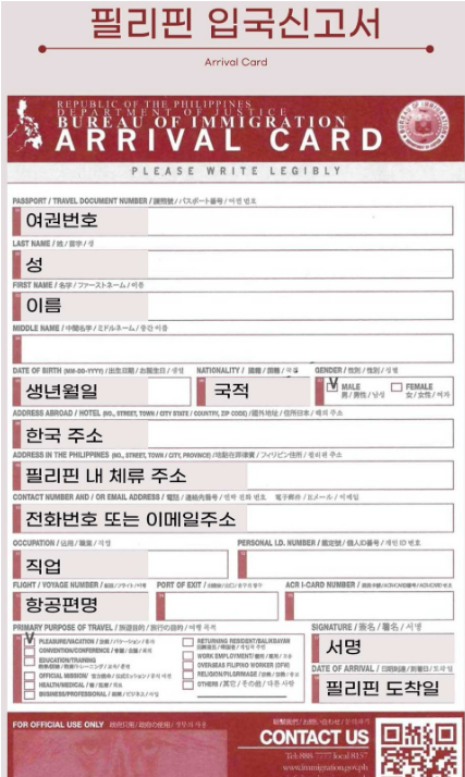 입국하는 본인의 여권번호 및 이름, 생년월일, 국적, 거주하고있는 국내 주소, 필리핀내 체류주소(체류하는 호텔명), 연락처, 직업, 항공편명에 대해 영문으로 작성 후 서명 및 필리핀 도착일 또한 작성하게 됩니다. 도착일은 월 - 일 - 년 순으로 작성해야 하며, 이트래블과 마찬가지로 모두 영문 작성해야 합니다.