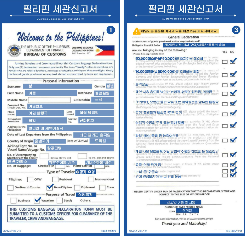 필리핀 여행시 비행기내에서 작성하게되는 입국신고서 및 세관신고서 작성법에 대해 알아보겠습니다.