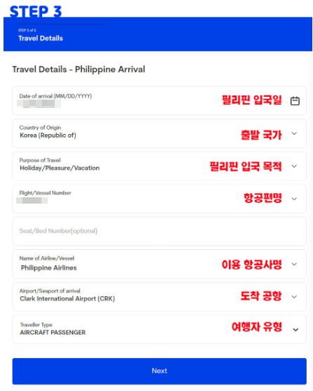 • STEP 3 - 필리핀 입국일 / 출발 국가 / 입국목적 / 항공편명 / 항공사 / 도착 공항 / 여행자 유형 작성.