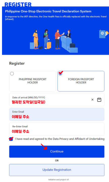 • REGISTER - FOREIGN PASSPORT HOLDER 선택 - 필리핀 도착일, E메일 주소 입력 후 개인정보 동의 체크.