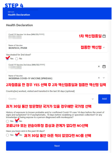 • STEP 4 - 건강상태 정보 (1차 코로나백신접종일, 접종한 백신명, 과거 30일 이내 방문한 국가, 본인의 건강상태)