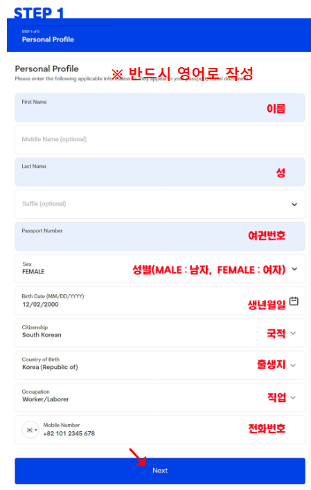 • STEP 1 - 이름 / 여권번호 / 성별 / 생년월일 / 국적 / 출생지 / 직업 / 전화번호 작성.