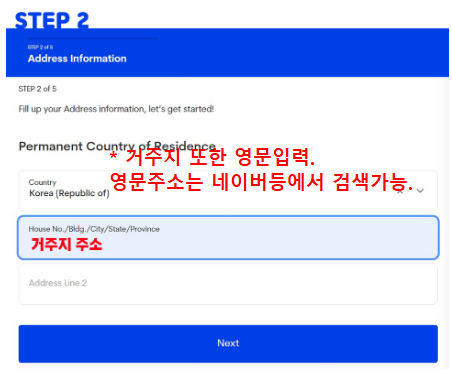 • STEP 2 - 본인이 거주하고 있는 주소 입력 (영문 주소를 모를경우 웹사이트 영문주소 변환 검색하여 작성)