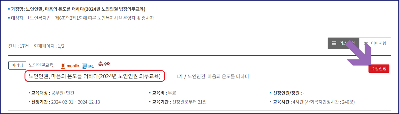 한국보건복지인재원에서 운영되고 보건복지 분야에서 일하는 종사자들에게 필수적으로 이수해야 하는 교육으로, 다양한 주제를 다루고 있습니다. 오늘 포스팅에서는 노인복지의 질을 높이기 위한 필수적인 과정인 노인인권 의무교육에 대해 안내해보겠습니다. 해당 교육 이외에도 아래 예시와 동일하게 수강신청이 이뤄지니 참고하시기 바랍니다.