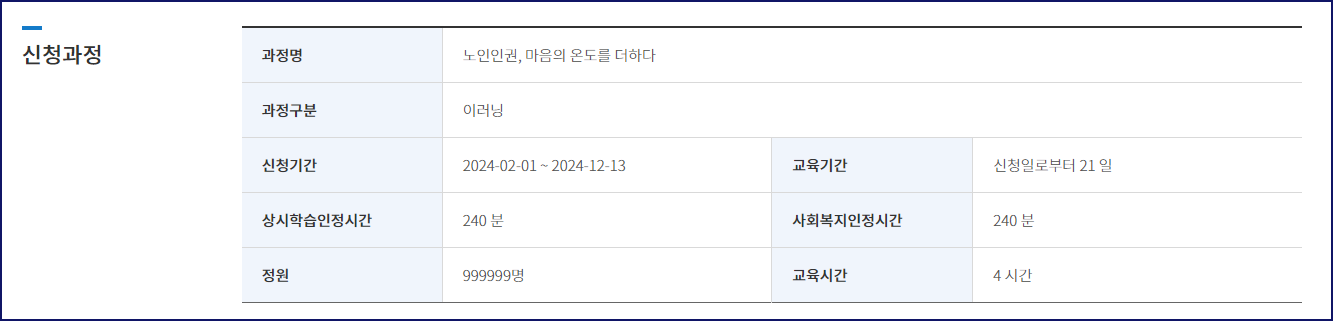 일부 교육 과정은 주기적으로 이수해야 할 의무가 있습니다. 예를 들어, 노인인권 교육은 주기적으로 갱신하여 수강해야 하며, 이수 기한이 만료되기 전에 다시 교육을 수강해야 합니다.