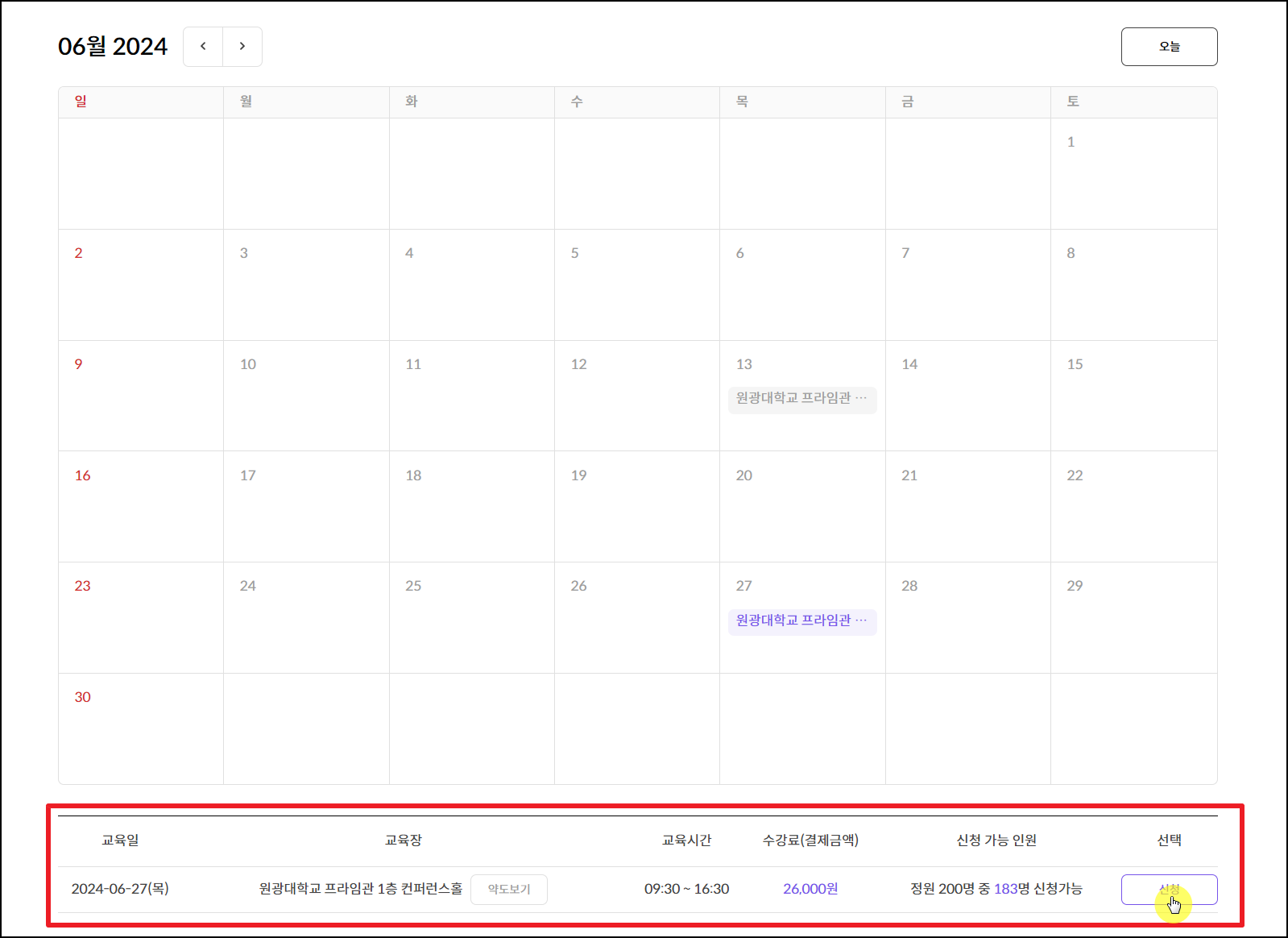 - 교육일정 및 교육장, 수강료 호가인 후 신청