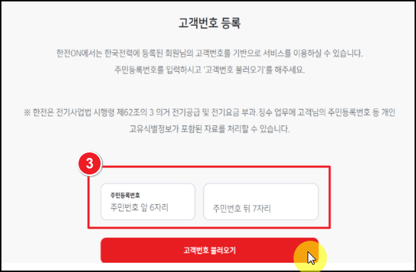 홈페이지 또는 어플내 본인인증 후 전기사용 계약관리 탭을 들어가게 되면 주민등록번호 입력을 통해 한전 고객번호를 조회할 수 있습니다. 단, 한전 명의자 본인 로그인 및 계약자 주민등록번호를 입력해야됨을 전달드립니다. 예를 들어 남편의 명의로 한전이 계약되어있다면 남편명의 로그인 및 주민등록 번호 조회를 통해 확인할 수 있습니다.