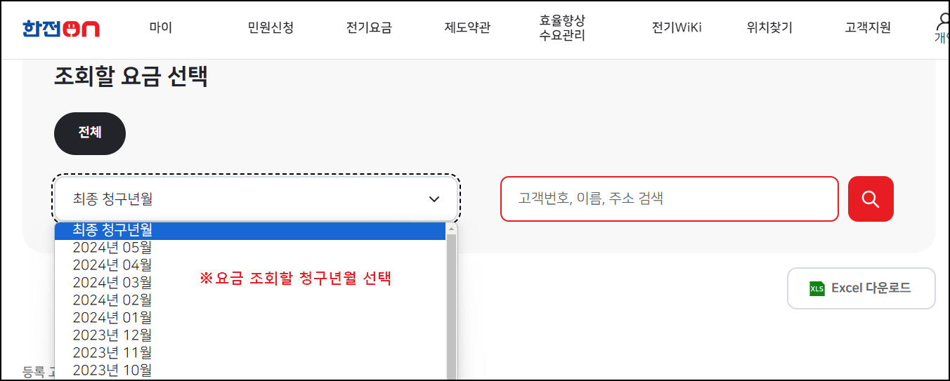 3. 요금조회할 청구년월 선택 (고객번호 입력 필요)