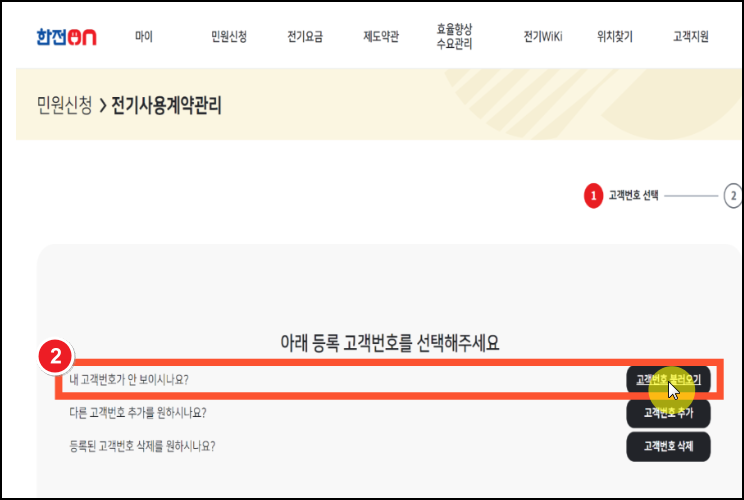 1. 한전ON 홈페이지 또는 어플에서 고객번호조회 후 요금조회 가능.