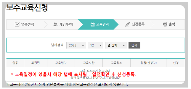 만약 신청 가능한 날짜가 있을 경우 과정명, 교육일자 및 시간, 장소, 신청인원 정보등이 표시됩니다.