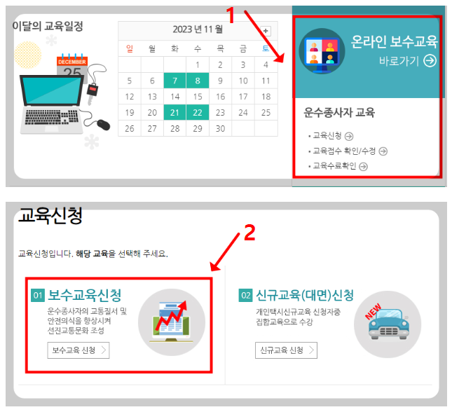 이제 아래에서 매년 의무적 시행해야되는 화물운송 종사자 보수교육 신청에 대해 알아보겠습니다.