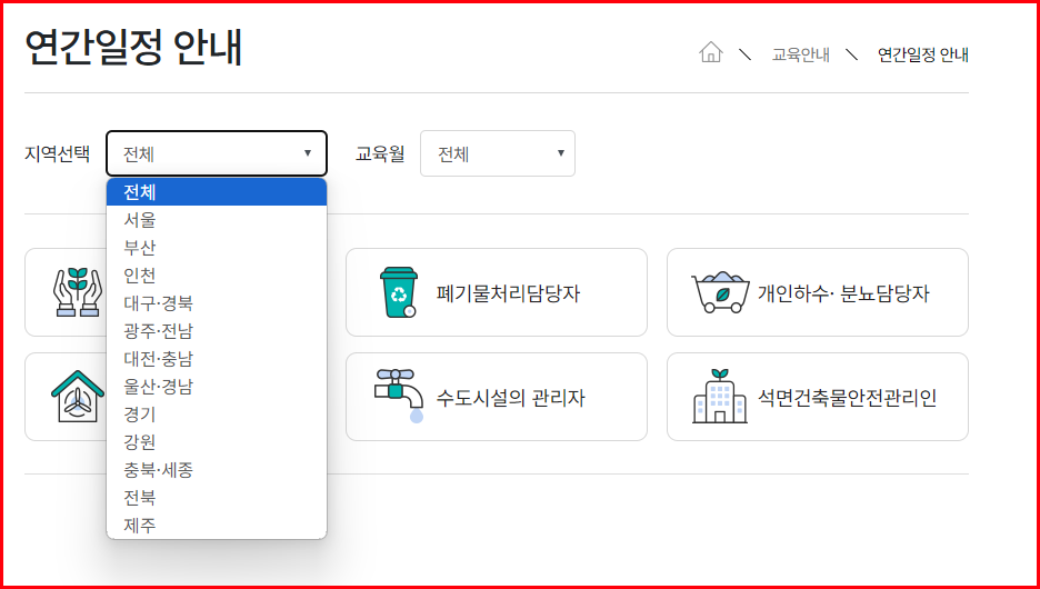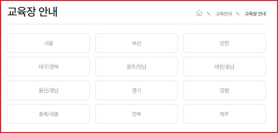 메뉴의 '교육안내→연간일정/교육장 안내'에서 원하는 분야를 선택한 후, 지역과 일정을 클릭하면 전체 일정과 해당 교육장의 세부 내용을 살펴볼 수 있도록 제공하고 있습니다.