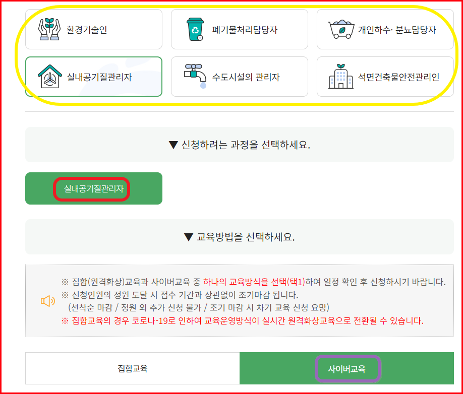 환경보전협회 사이버 법정교육의 수강 신청 및 이수 방법에 대해 알아보겠습니다. 실내공기질관리자를 예로 들어 수강 신청 및 이수 과정을 설명드리겠습니다. 다른 과정 역시 동일한 절차로 운영되므로 이를 참고하여 이수하시기 바랍니다.