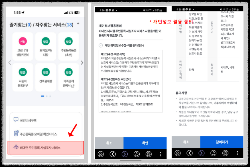 반드시 단말기상 위치 정보가 등록된 주소지와 같아야 되며, 상이한 경우 정상적 참여가 불가 합니다. 그렇기에 주민등록 사실조사 비대면 참여시 반드시 본인의 주민등록상 주소지에서 진행해야 합니다.
