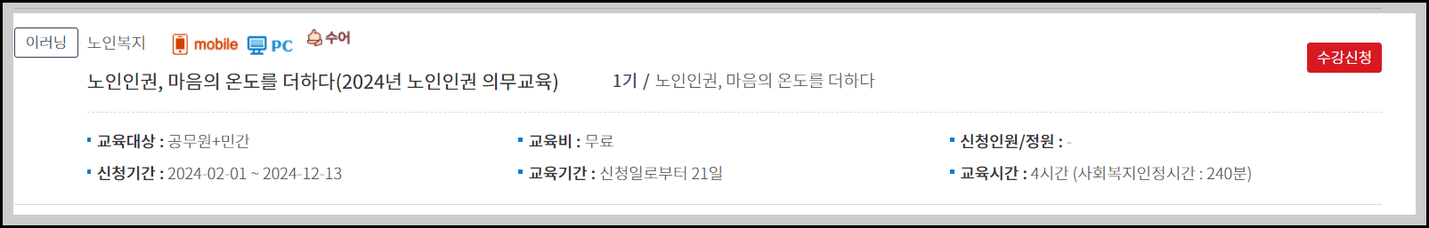 - 노인인권, 마음의 온도를 더하다 (2024년 노인인권 의무교육) 수강신청.