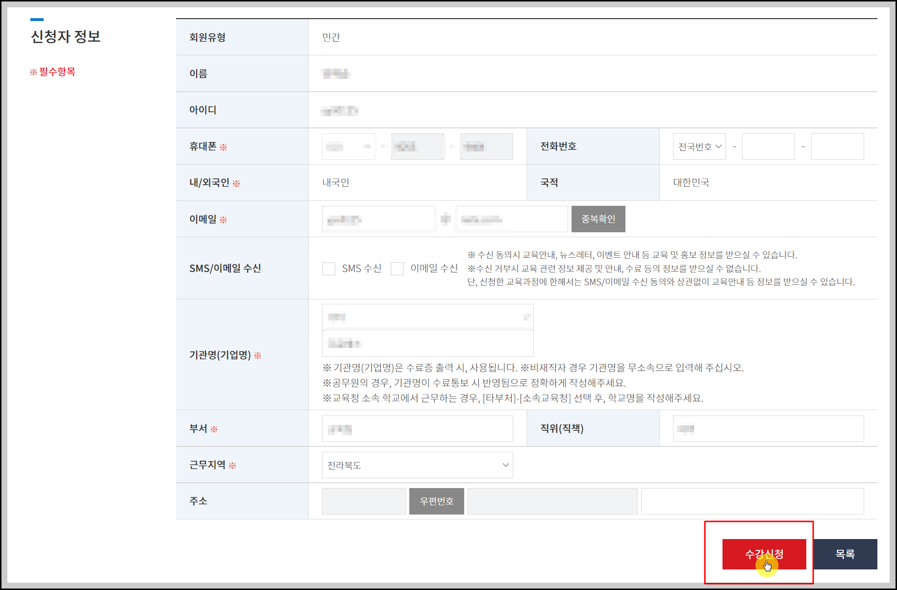 만약 비재직자일 시 기관명을 무소속으로 입력 / 공무원의 경우 기관명이 수료 통보시 반영되기에 정확한 입력이 필요합니다. 교육청 소속 학교에서 근무하는 근로자의 경우 타부처 - 소속교육청 선택 후 학교명을 입력하면 됩니다.