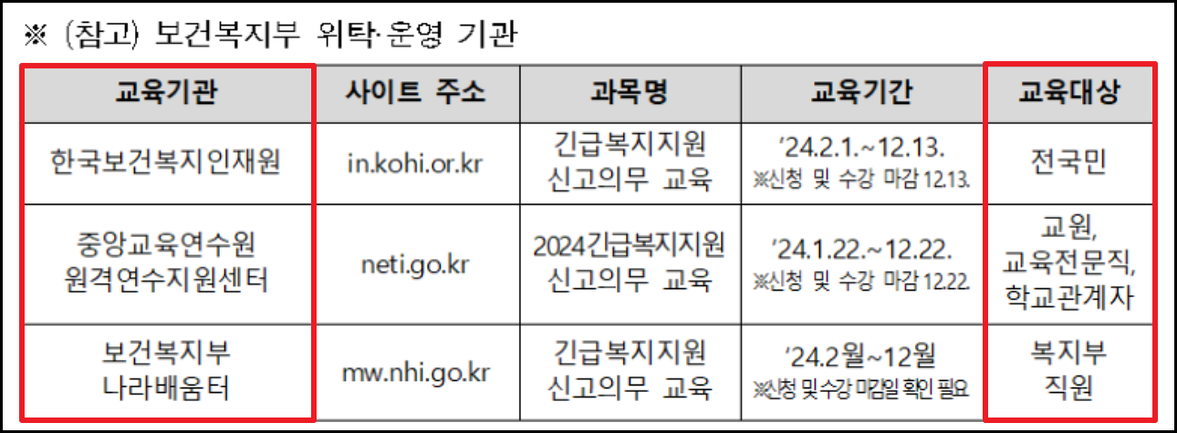 이들은 직무를 수행하는 과정에서 긴급지원 대상자를 발견하면 해당 시, 군, 구청에 이를 신고하여 신속하게 지원을 받을 수 있도록 돕습니다. 위 표를 참고해보면 교육대상 별 교육기관이 상이 합니다. 한국보건복지인재원에서는 전국민을 대상으로 긴급 복지지원 신고의무자교육을 지원하고 있으며, 교원등 학교관계자의 경우 중앙교육 연수원 홈페이지를 통해 이수할 수 있습니다.