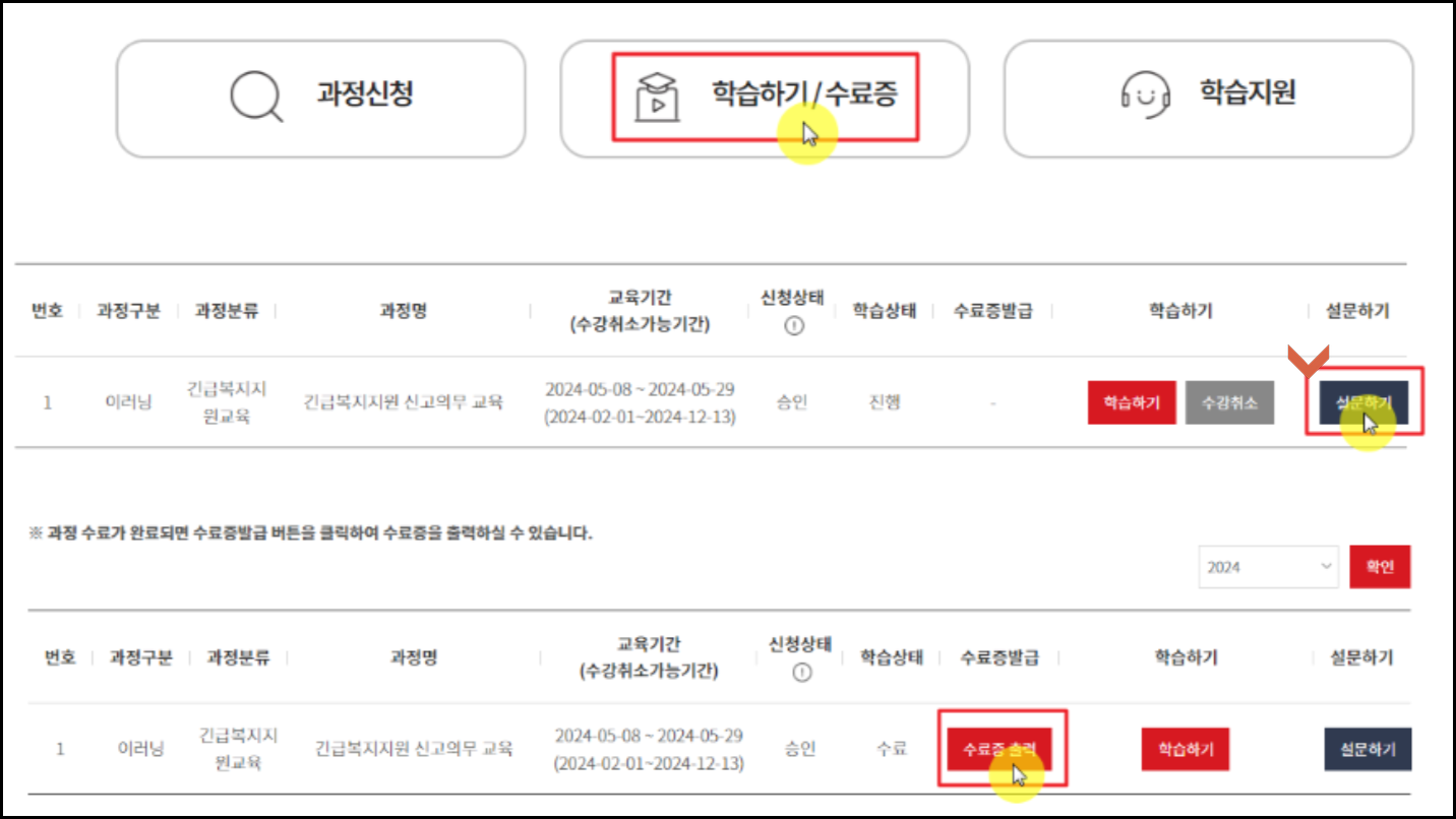 교육 내용 등에 관한 설문지를 간단히 작성한 후, 수료증 발급을 통해 수료증을 받을 수 있습니다.