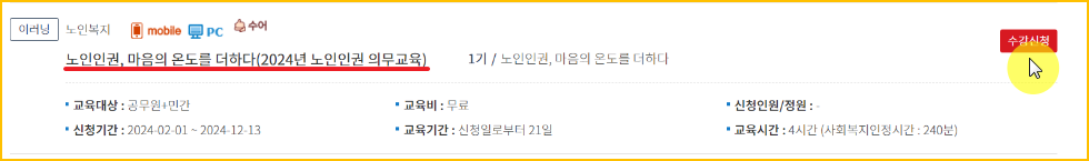 노인인권, 마음의 온도를 더하다 이러닝 수강정보를 확인 후 수강신청을 클릭 합니다.