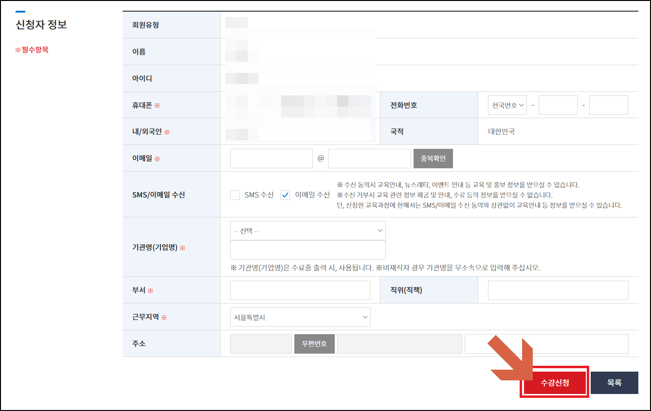 - 수강신청 - 신청과정 확인 후 신청자 정보 입력.
