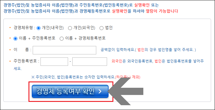 - 본인의 농업 경영체 등록 여부를 확인을 위한 이름 / 주민등록번호 입력.