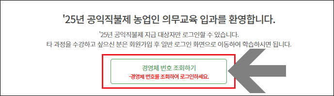 - 25년 공익직불제 농업인 의무교육 입과 - 경여체 번호 조회하기 클릭