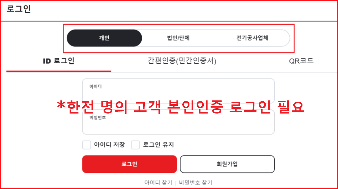 - 주의: 로그인 시 한전 계정의 명의자가 본인이어야 합니다.