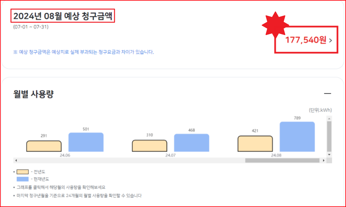 - 월별 사용량, 전력량, 다음 달 예상 요금, 그리고 한국전력의 전기요금을 한눈에 확인할 수 있습니다.