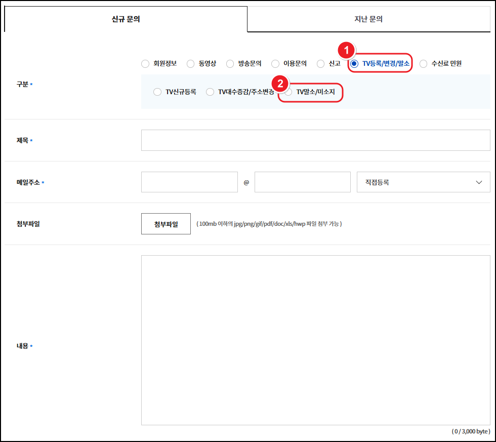 - 회원가입 또는 로그인 : 본인인증 로그인 진행 후 수신료 관련 1:1민원신청 클릭 후 - TV신규등록/TV말소