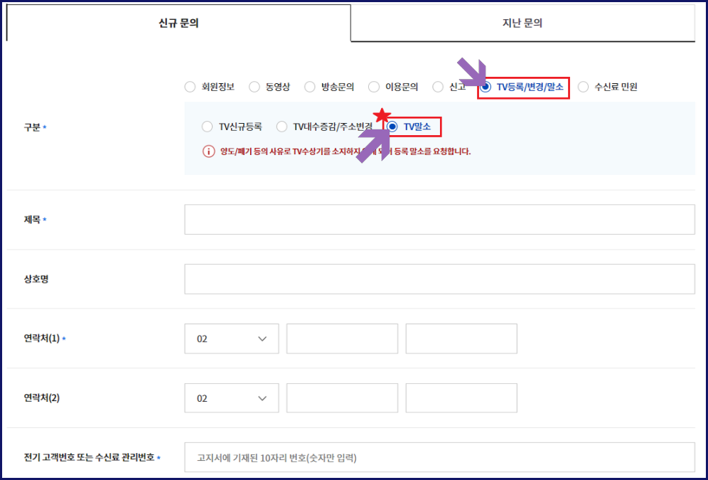 홈페이지에 방문하여 로그인합니다(네이버나 카카오톡을 통한 간편 로그인도 가능합니다). 이후 '수신료 1:1 문의' 메뉴에서 'TV 신규 등록/변경/말소'를 선택합니다. 'TV 말소' 항목을 선택한 후 해지 요청을 작성하고 등록 버튼을 클릭하여 절차를 완료합니다.